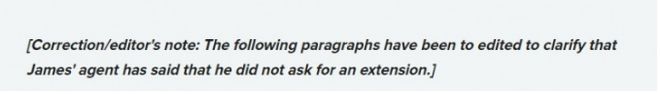 不过如今Yaron Weitzman重新修改文章辟谣,他表示:“文章内容已经修改,詹姆斯经纪人(里奇-保罗)说过,他没有向湖人要求提前续约。”