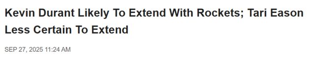 北京时间9月28日,据名记Jake Fischer报道,外界普遍认为杜兰特最终会与火箭达成续约协议,而伊森的完成续约可能性低于杜兰特。